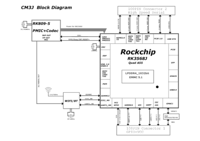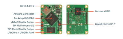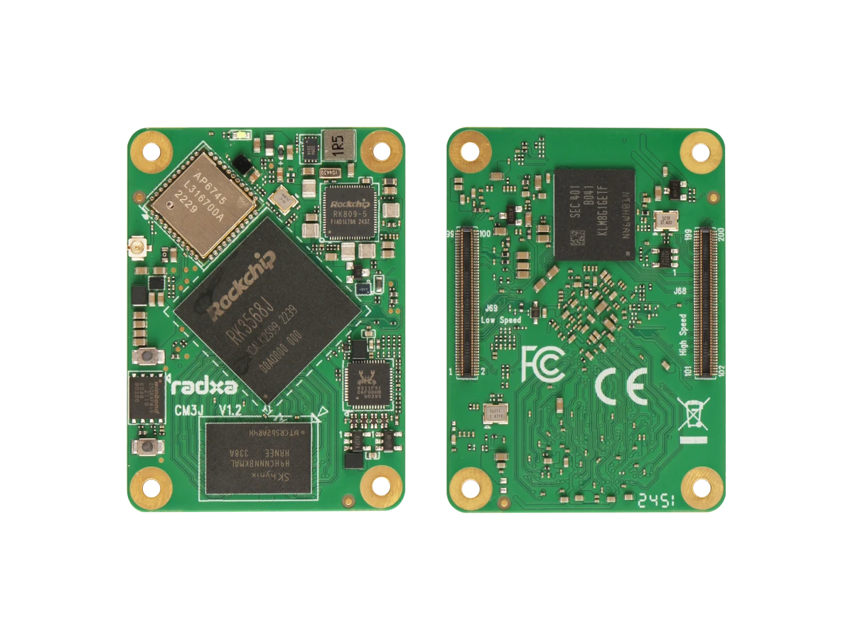 O Radxa CM3 J, um módulo de computação industrial repleto de uma variedade de recursos avançados, é meticulosamente criado com base no SoC Rockchip RK3568J. Este módulo extraordinário mostra suas proezas integrando perfeitamente o armazenamento de CPU, GPU, NPU, PMU, memória LPDDR4, Wi-Fi e eMMC dentro de um formato notavelmente compacto, medindo apenas 55 mm x 40 mm.